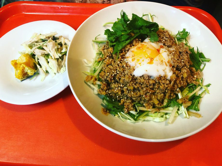 ランチは全品サラダ付き。胡麻たっぷりの肉味噌をご飯にのせて丼ものにしました。温玉が全体をマイルドに仕上げています。