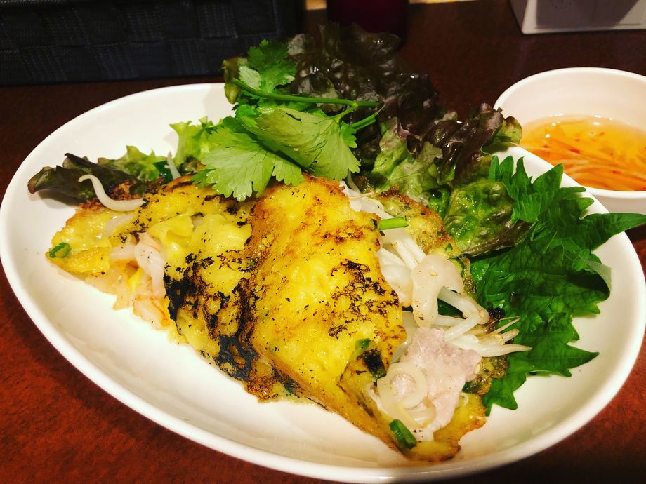 ベトナム風お好み焼きです。パリパリの薄い生地に、もやし、海老、豚肉を炒めて包みました。しそなどと一緒にタレをつけてどうぞ。